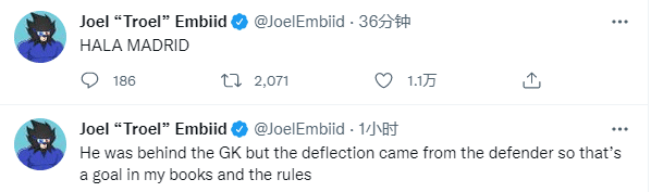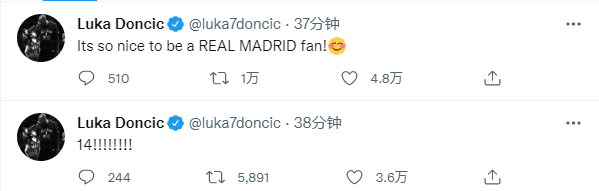 欧冠决赛期间,恩比德吐槽本泽马进球被吹越位,之后发推高呼HALA MADRID祝贺皇马夺冠;东契奇发推写道:14冠!!!成为一个皇马球迷的感觉真是太棒了!