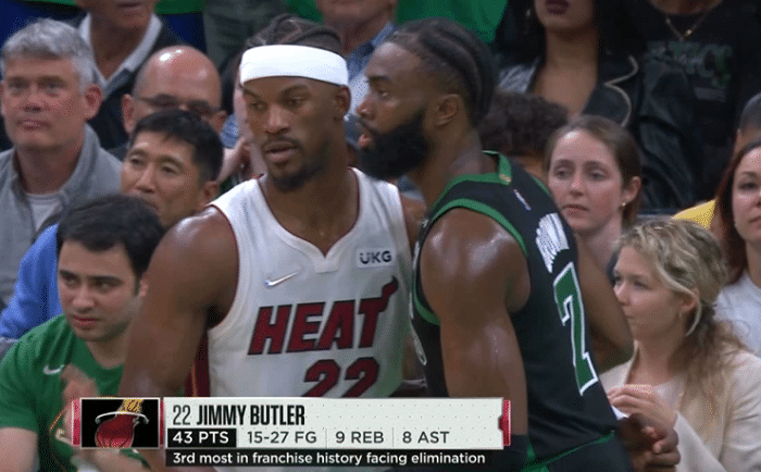 巴特勒关键2+1,塔克抢断塔图姆,巴特勒制胜一击,布朗致命失误,罚球终结比赛,最终热火拿下G6,东决抢七大战来了,巴特勒全场仅歇2分钟,崴脚后仍打进关键2+1,太硬气太拼了,得分创季后赛生涯新高,超越詹姆斯还创队史生死战最高得分,恩比德、德罗赞等球员盛赞巴特勒。