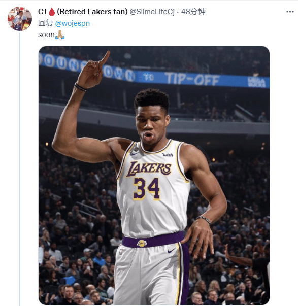 球迷晒神图恶搞字母哥身穿湖人球衣,调侃字母哥即将加盟湖人。