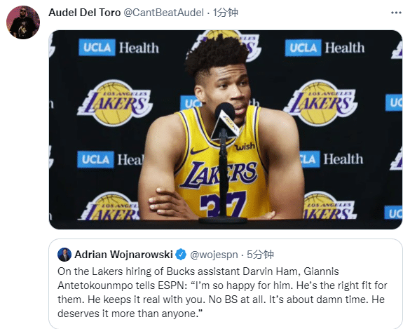 对于哈姆担任湖人主帅,雄鹿当家球星字母哥也发声,字母哥表示:我由衷地为哈姆感到高兴,他是最适合湖人主帅的人选。哈姆对人非常真诚,从来没有废话。是时候了,他比任何人都更值得得到这份工作。