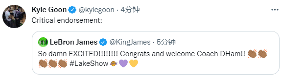 来源:JRS直播网05-28 16:11JRS直播网05月28日讯 ,湖人新任主帅已经敲定,雄鹿助教达尔文-哈姆成为湖人第28任主帅,和湖人签下一份4年执教合同,合同金额暂时曝光;詹姆斯已经激动发声,欢迎哈姆执教湖人。