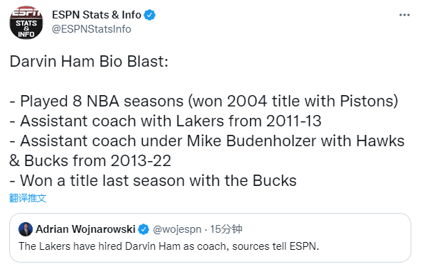 哈姆是在2018年加入雄鹿教练组,担任球队首席助教,2021年他跟随雄鹿队夺得总冠军;哈姆曾在2004年以球员的身份跟随活塞夺得总冠军,曾担任过老鹰和湖人助教,曾和詹姆斯对战;如今哈姆成为湖人主帅,新赛季将执教詹姆斯。