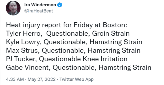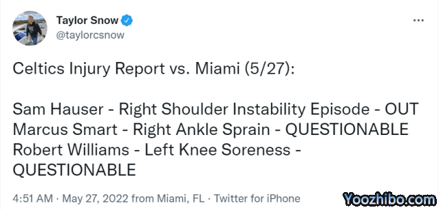 来源:JRS直播网05-27 11:04JRS直播网05月27日讯,热火和凯尔特人公布了东决G6的最新伤情。绿军方面,斯马特(右踝扭伤)和罗伯特-威廉姆斯(左膝酸痛)被列为出战成疑,豪瑟(右肩伤病)继续缺阵;热火方面,希罗(腹股沟拉伤)、塔克(膝盖伤病)、洛瑞(腿筋拉伤)、斯特鲁斯(腿筋拉伤)、文森特(腿筋拉伤)都是出战成疑。塔图姆和巴特勒都不在伤病名单上,确定出战G6,但两人都是带伤作战,塔图姆肩膀有问题,巴特勒的膝盖也有伤。