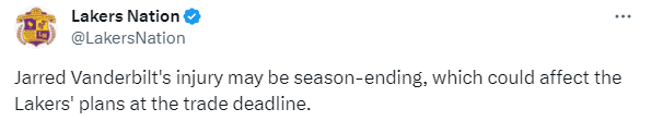 在湖人击败凯尔特人的比赛中,范德比尔特在上半场最后时刻抢断塔图姆后遭遇无接触受伤,虽然X光检查呈阴性,但他的脚伤很严重,预计将因伤赛季报销。