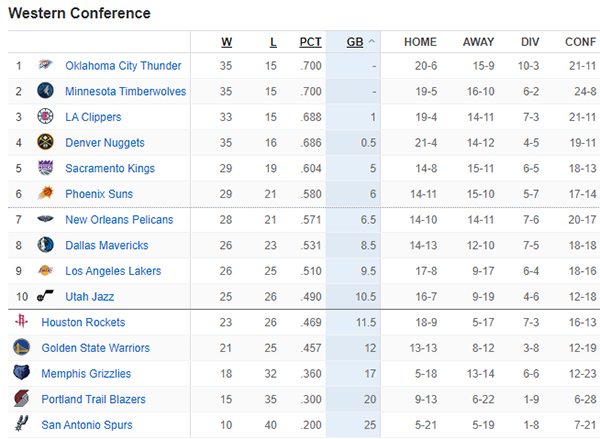 西部前6具体排名:1、雷霆(35胜15负);2、森林狼(35胜15负;3、快船(33胜15负);4、掘金(35胜16负);5、国王(29胜19负);6、太阳(29胜21负)