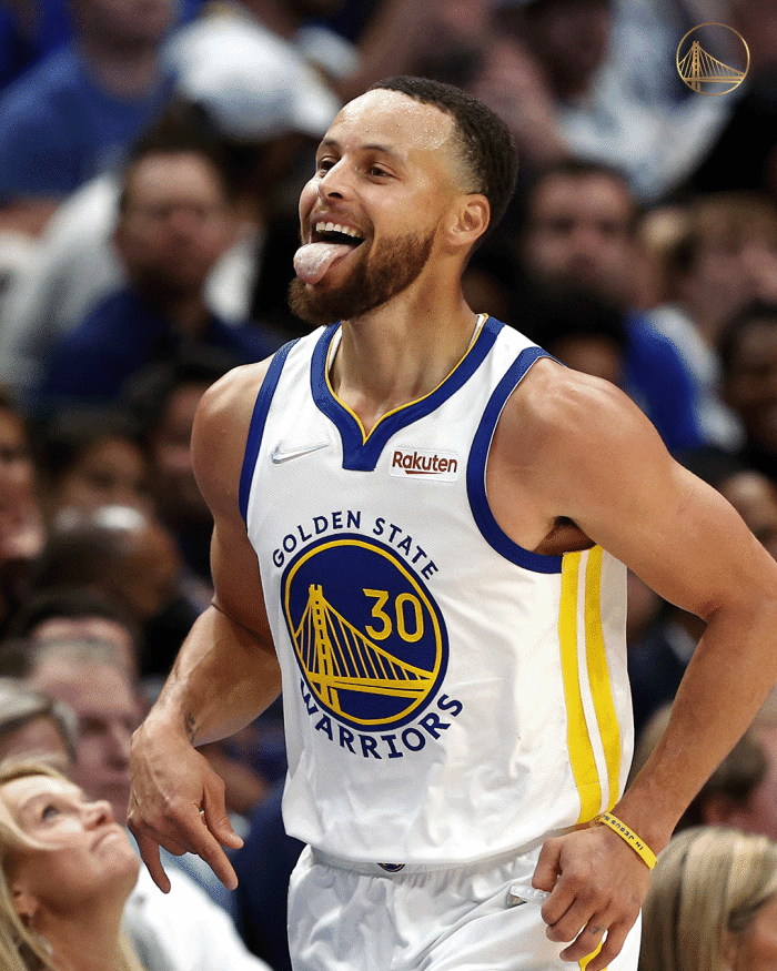 第二节,勇士和独行侠打得十分胶着,打着打着库里突然开火,迎着防守轰进三分,之后三分出手提前转身庆祝,球进反超比分,直接打停独行侠,此时库里吐舌疯狂庆祝,随后扑防时被场边人员绊倒;半场打完库里拿到16分5助攻4篮板;值得一提的是,波特第二节受伤退赛,格林不满被吹回场违例吃到技犯。