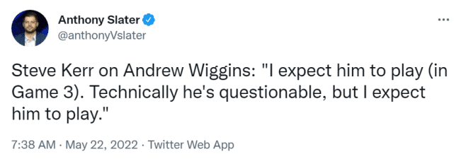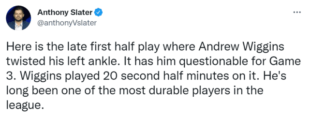 来源:JRS直播网05-22 15:28JRS直播网05月22日讯 ,西决G3的伤病报告上,维金斯左踝酸痛,被列为questionable(出战成疑,上场可能性50%)。勇士跟队记者Slater也晒出了维金斯受伤的一幕。他在G2上半场还剩2分24秒时扭到了左脚。