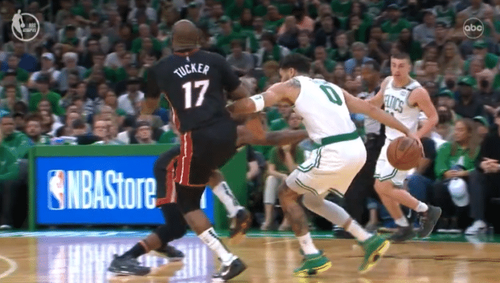 第二节,塔图姆在进攻时推倒PJ-塔克,这球吹罚进攻犯规没问题,不过塔克夸张的假摔表演冲上热搜引热议,37岁塔克像冰壶似的,从三分线外摔倒并且滑出底线。