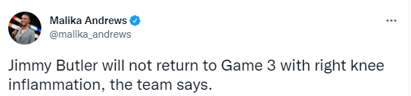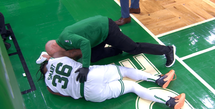 巴特勒因右膝出现炎症,本场比赛不会回归,伤退前出战19分钟,8投3中拿到8分3篮板2助攻2抢断;第三节,凯尔特人悍将斯玛特90度崴脚后痛苦倒地,怒吼大叫,最终被两人搀扶离场,之后又跑回替补席,全场为他鼓掌致敬,重新上场。