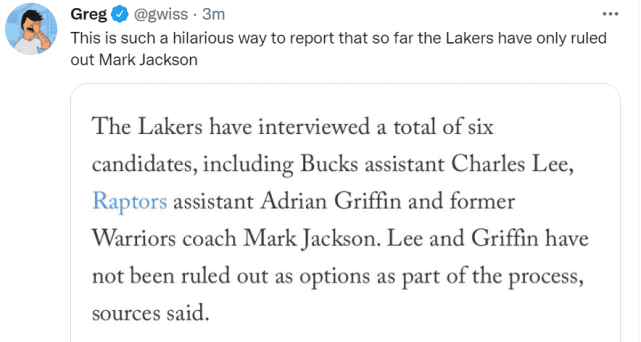 湖人一共面试了六位候选人,除了最终入围的三位,他们还面试了雄鹿助教查尔斯-李、猛龙助教阿德里安-格里芬和前勇士主帅马克-杰克逊。消息人士透露,李和格里芬并没有完全出局。