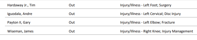 来源:JRS直播网05-20 14:45JRS直播网05月20日讯,NBA官方公布了西决G2的伤病报告,勇士和独行侠共有4人缺席。独行侠一方缺阵的是小哈达威,他因左脚伤势已经赛季报销。勇士一方缺阵的人员也没有变化,伊戈达拉(颈椎伤病)、小佩顿(左肘骨折)和怀斯曼(右膝伤病)将继续缺席G2的比赛。