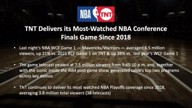 来源:JRS直播网05-20 14:43JRS直播网05月20日讯,TNT公布了西决首战的收视率。据报道,这场比赛的平均收视人数为650万人,比2021年的东决G1提升21%,比去年的西决G1提升38%。当地时间晚上9点45分至10点,收视人数来到最高的750万人,该场比赛与之后的《Inside the NBA》节目一起成为了当日有线电视频道中收视率最高的两档节目。