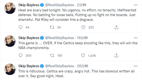 名嘴斯基普-贝勒斯发推:这场比赛...结束了。如果凯尔特人继续这样投篮,那么他们会夺冠;斯基普还发推写道:今晚热火打得没有紧迫感,没有努力,没有坚韧,防守不专心,没有拼尽全力,简直可耻;帕特-莱利会认为这是一种耻辱。