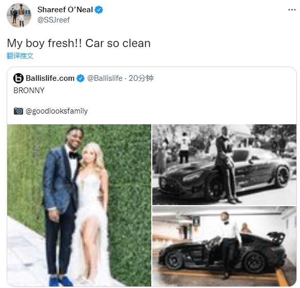 奥尼尔的儿子谢里夫-奥尼尔转发布朗尼参加舞会的照片,发推写道:我的兄弟太帅,车子很干净。