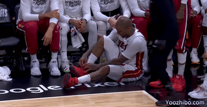 第二节6分25秒,PJ-塔克在一次防守中不幸无接触受伤,右脚受伤后无法坚持,之后他坐在场边并且捂着右脚十分痛苦,热火队医过来问候他的情况,之后塔克一脸痛苦和沮丧,一瘸一拐走回更衣室,接受检查和临时治疗;离场前,塔克上半场出战10分钟,2投1中拿到2分2篮板1助攻。