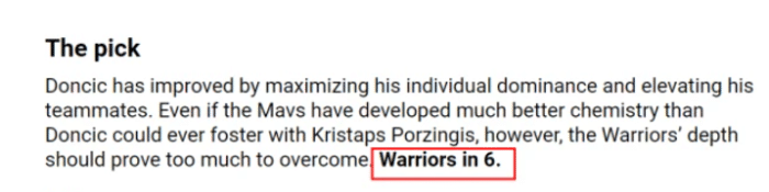 对于今年的分区决赛,NBA官网预测勇士4-2淘汰独行侠,凯尔特人4-2淘汰热火,换句话说,官网预测勇士和凯尔特人将会师总决赛从而争夺总冠军。