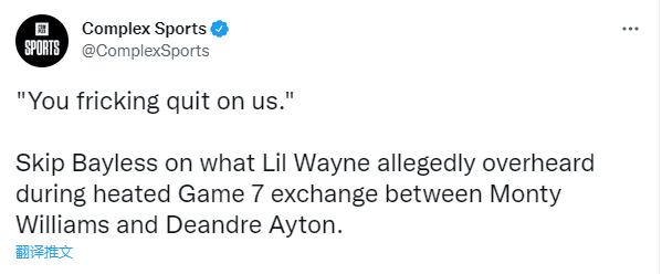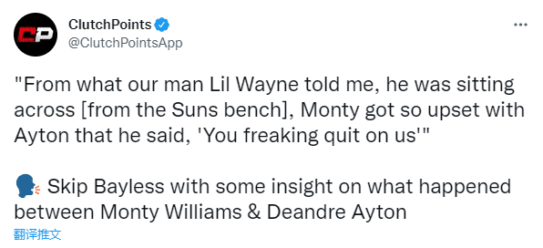 来源:JRS直播网05-17 11:08JRS直播网05月17日讯 在西部半决赛G7生死战中,太阳33分惨败独行侠,大比分3-4被淘汰出局;太阳出局还爆发内讧,艾顿和蒙蒂-威廉姆斯在太阳替补席发生激烈争执;美媒爆料内幕,蒙蒂对艾顿非常生气,爆粗口:你TM的放弃了我们。