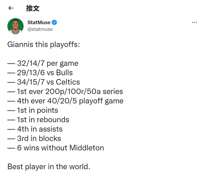 7场比赛,字母哥场均可以送出34分15板7助攻的全能数据,单轮系列赛3次砍下至少40分10板,G6成为NBA季后赛历史第4位单场送出至少40分20板5助攻的球员,而且单轮系列赛砍下了200+得分100+篮板50+助攻,是NBA75年历史首位在单轮系列赛送出至少200分100板50助攻的球员。