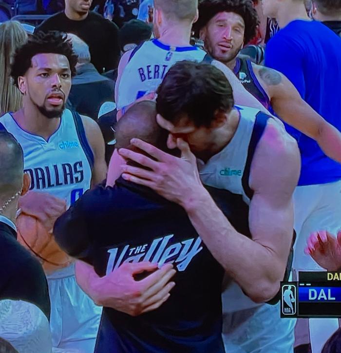 赛后,保罗和东契奇握手致意,布克拥抱东契奇也表达敬意,大博班拥抱保罗,他的大手包住保罗的脑袋,十分抢镜。
