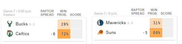 FiveThirtyEight公布了G7的最新获胜概率,凯尔特人的获胜概率是72%,太阳的获胜概率是69%,都是主场作战的球队更被看好。
