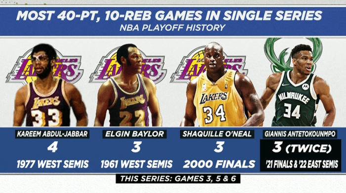 2、字母哥季后赛第7次30+15+5追平埃尔金-贝勒并列历史第四,史上只有张伯伦、贾巴尔和詹姆斯拥有更多次数
