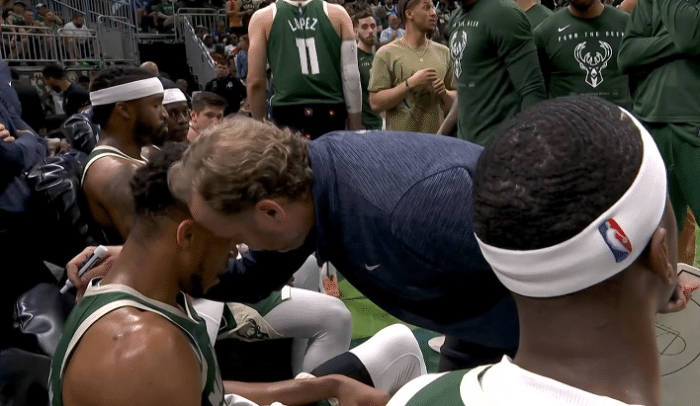 第二节,字母哥反击中撞倒斯玛特打成2+1(罚球没进)以及强突换手扣篮,不过单节8投2中仅贡献4分,字母哥手感下滑,雄鹿单节17-25又输8分,半场落后10分。