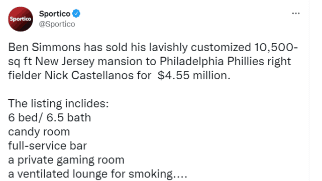 来源:JRS直播网05-13 16:15JRS直播网05月13日讯 ,据知名体育商业媒体Sportico报道,篮网球星本-西蒙斯以455万美元的价格将自己定制的新泽西豪宅卖给卡斯特拉诺斯,后者是一位职业棒球运动员。西蒙斯这座豪宅面积约975平方米,有6个卧室、6.5个卫生间、游戏室、私人电影院等设施。走廊里,还陈列着他各个时期的球衣。西蒙斯的挂牌价是500万美元,最终以455万美元成交!