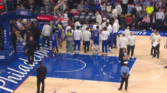 这是首节,恩比德突破上篮打进,他倒地之后正好压在了篮下准备争抢篮板球的丹尼格林的腿上,后者痛苦倒地,恩比德没有太注意,而是自顾自的回防。随后丹尼格林无法坚持,队医进场,丹尼格林回到更衣室治疗。