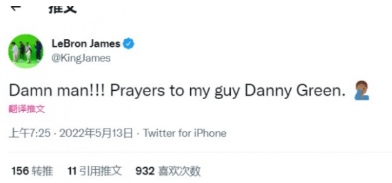 很快詹姆斯送祈祷,他表示:“该死!!为我的兄弟丹尼-格林祈祷!”