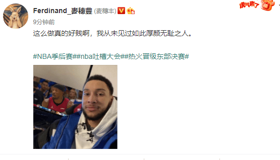这场比赛结束之后,76人旧将本-西蒙斯引发巨大的争议,起因是他在社交媒体上晒出了自己观看老东家的比赛,当巴特勒投进得分,热火在末节优势拉大到20分。本西进行合影,很开心看到老东家76人被淘汰。
