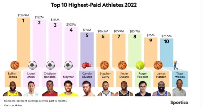 此前著名体育财经网站Sportico发布了2022年度全球运动员年收入前100名榜单,湖人球星詹姆斯以1.269亿美元登顶,排名全球运动员第一;詹姆斯年薪3690万和赞助费9000万,12个月狂赚1.269亿美元,年收入力压梅西、C罗高居世界第一。