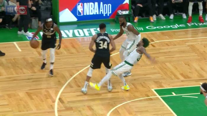 末节,凯尔特人扩大领先,康诺顿和霍乐迪接连轰进续命三分,字母哥撞倒对手吃到进攻犯规,之后马修斯轰进三分,字母哥二次补扣,雄鹿一波攻势追到仅落后2分;关键时刻,字母哥撞倒斯玛特又吃到进攻犯规,布登霍尔泽不满判罚,和裁判吵起来。