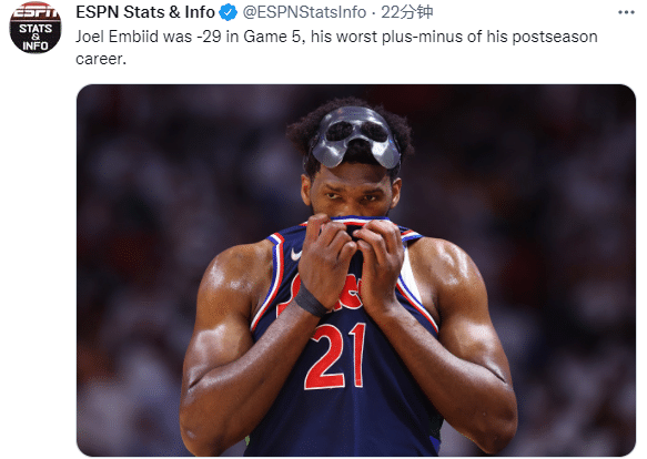 今日一战,恩比德全场12投7中拿到17分5篮板2助攻,上半场仅仅贡献6分,全场正负值-29,创职业生涯季后赛最差纪录。