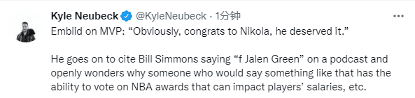 谈到约基奇夺得本赛季MVP,恩比德表示:很明显,他应得的,恭喜约基奇;恩比德还表示自己、字母哥和布克都值得MVP:我不知道自己还需要做什么才能赢得MVP,随便了。