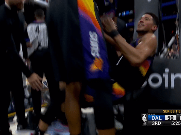第三节5分25秒,布克持球突破杀到禁区,芬尼-史密斯凶狠犯规推飞布克,布克的身体失去平衡,重摔倒地十分痛苦,趴在地板上缓了一会后,布克被队友拉起来,此时布克笑了;裁判多角度回放这一幕,最终吹罚芬尼-史密斯一级恶犯,布克两罚一中,太阳17-0领先到10分。
