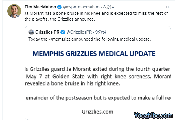 来源:JRS直播网05-11 11:01JRS直播网05月11日讯 ,灰熊官方公布莫兰特的核磁检查结果,伤情确诊为右膝骨挫伤,大概率缺席季后赛的剩余赛程,预计将会赛季报销;灰熊大比分1-3落后,莫兰特伤停,再输一场就将被勇士淘汰出局。
