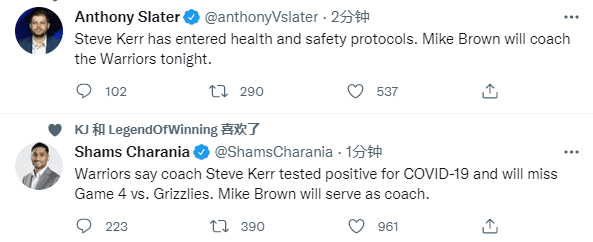 来源:JRS直播网05-10 15:30JRS直播网05月10日讯 ,NBA季后赛勇士再战灰熊,G4大战赛前勇士遭重创,据名记shams以及勇士跟队记者报道,科尔触发联盟的健康与安全协议,并且检测结果成阳性,感染新冠被隔离,勇士助教迈克-布朗代替科尔执教G4。