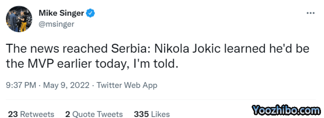 Mike Singer还报道称,自己在首轮第5战赛后曾经问过约基奇:如果再次当选MVP,他会如何庆祝?当时约基奇的回答是:“很可能是和亲友在一起,享受一些音乐和啤酒。应该和你想做的是一样的。”