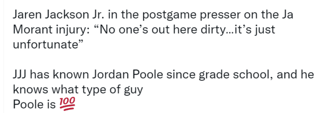 赛后的新闻发布会上,有记者询问杰克逊对普尔造成莫兰特受伤的看法。杰克逊的回应是:“这里没有人是肮脏的……(莫兰特受伤)只是运气不好。”杰克逊和普尔已经是多年的好友,他太了解这个小兄弟了,他知道普尔是怎样的人。就像普尔自己说的那样,“我不是那种(肮脏的)球员,我尊重所有人”。