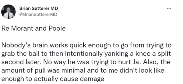 医学专家Brian Sutterer也表示,“没有人的大脑能运转得那么快,从试图抢球到一秒钟后故意猛拉膝盖。他(普尔)不可能想故意伤害莫兰特。而且,他的拉力很小,在我看来,不足以造成膝盖的伤害。”