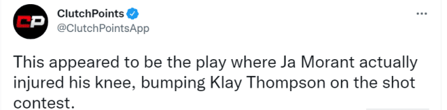 目前,是不是普尔造成莫兰特受伤,其实还没有定论。美媒clutchpoints晒出了莫兰特第三节扑防汤普森的一幕,当时莫兰特的膝盖就和汤普森相撞,他也有些踉跄。clutchpoints认为莫兰特有可能在那个回合里就已经伤到膝盖了。