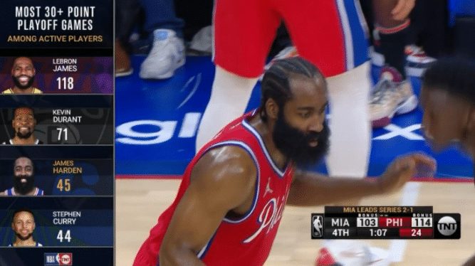 同时哈登还创造了一系列的纪录,其中就包括哈登成为76人队史上首位能在季后赛中取下30分5板5助并命中5记三分的球员。哈登第45次季后赛砍下30+,领先库里一场,位居现役第三。