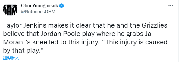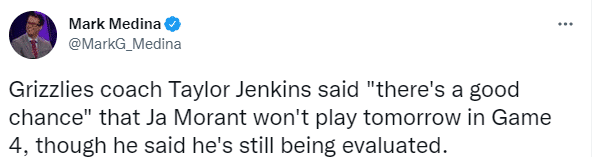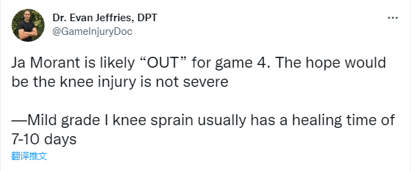 对于莫兰特的伤情,医学专家Evan Jeffries表示,莫兰特可能会缺席在第 4 场比赛,希望他的膝盖伤势不严重 ,轻度 I 级膝关节扭伤,一般愈合时间为 7-10天;换句话说,莫兰特可能至少休战7天,而灰熊和勇士最多打到第七场(5月17日),可能因伤缺席次轮剩余比赛。