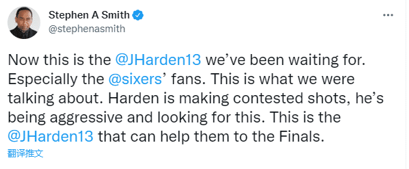 哈登疯狂一战获盛赞,勇士老将伊戈达拉发推:哈登让那些批评者都沉默了;名嘴A-史密斯表示:这就是我们一直所期待的哈登,特别是对于76人的球迷来说。这就是我们所讨论的。哈登在命中受干扰下的投篮,打得很有侵略性,一直在寻找这样的机会。这就是哈登,他能帮助76人闯进总决赛。
