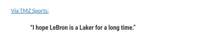 TMZ体育记者在街头遇到魔术师,向他提问:“很多人认为湖人该交易詹姆斯,他们应该这么做吗?”魔术师回应道:“勒布朗,我希望他能长期成为一名湖人球员。”