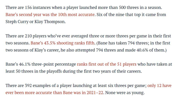 在NBA历史上,有210名球员在生涯前两季场均至少投中3个三分球,贝恩的命中率在其中排名第5。一个有趣的巧合,贝恩前两个赛季一共出手794次三分球,他投中了345个,命中率是43.5%,而汤普森前两个赛季也一共出手794次三分球,他投中了322个,命中率是40.6%。换言之,贝恩和同期汤普森的三分出手总数一样多,但比汤普森更准。