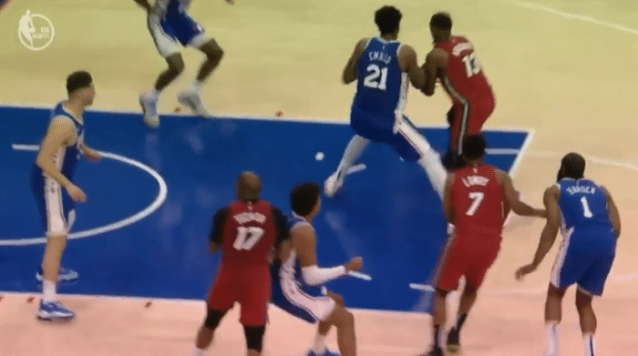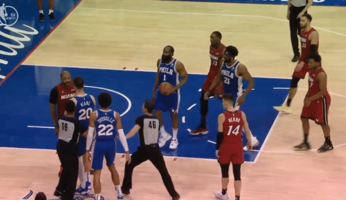 末节10分16秒,塔克和塞布尔卡位时发生身体接触,显示塞布尔撞了一下塔克,之后塔克从背后肘击对手,两人纠缠并且互喷垃圾话,见状尼昂第一时间劝架,之后哈登、恩比德也围过来,最终塔克和塞布尔各自吃到一次技术犯规。