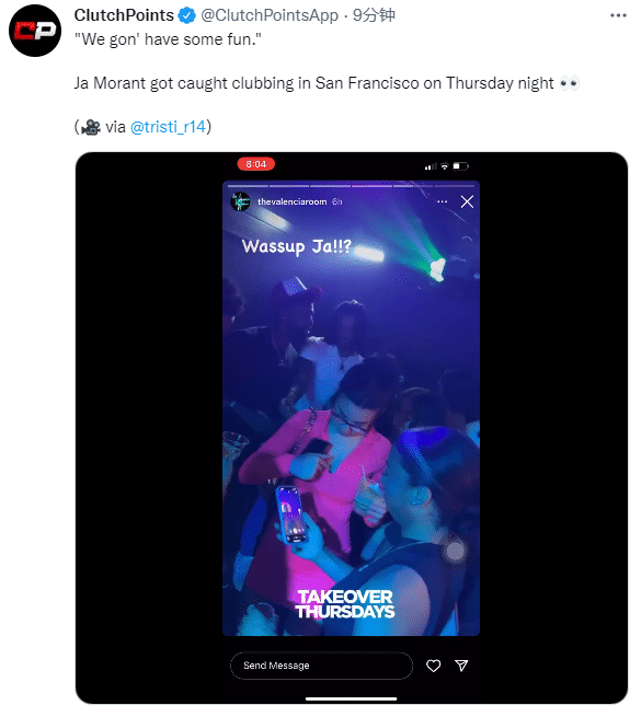 有球迷晒出了自己在夜店偶遇莫兰特的画面,现场灯红酒绿、美女如云;莫兰特身穿白色T恤并且开心热舞,美媒ClutchPoints发推写道:莫兰特昨晚在夜店被抓拍,还写道:我们玩得很开心。