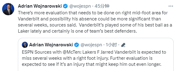Woj报道,范德比尔特预计因伤缺席数周,并且可能缺席比数周更长的时间,他将在未来几天接受更广泛的咨询,以确定他的脚中部区域受伤的程度,以及是否有必要进行可能会导致赛季报销的手术。