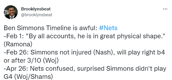 在今年交易截止日,篮网和76人达成一笔大交易,送走哈登和米尔萨普得到西蒙斯、小库里、庄神和两个选秀权;离开76人加盟篮网之后,西蒙斯一直遭受背伤的困扰,曾接受硬膜外注射治疗从而缓解痛疼,治疗后曾计划3月10日复出,无奈因伤推迟。